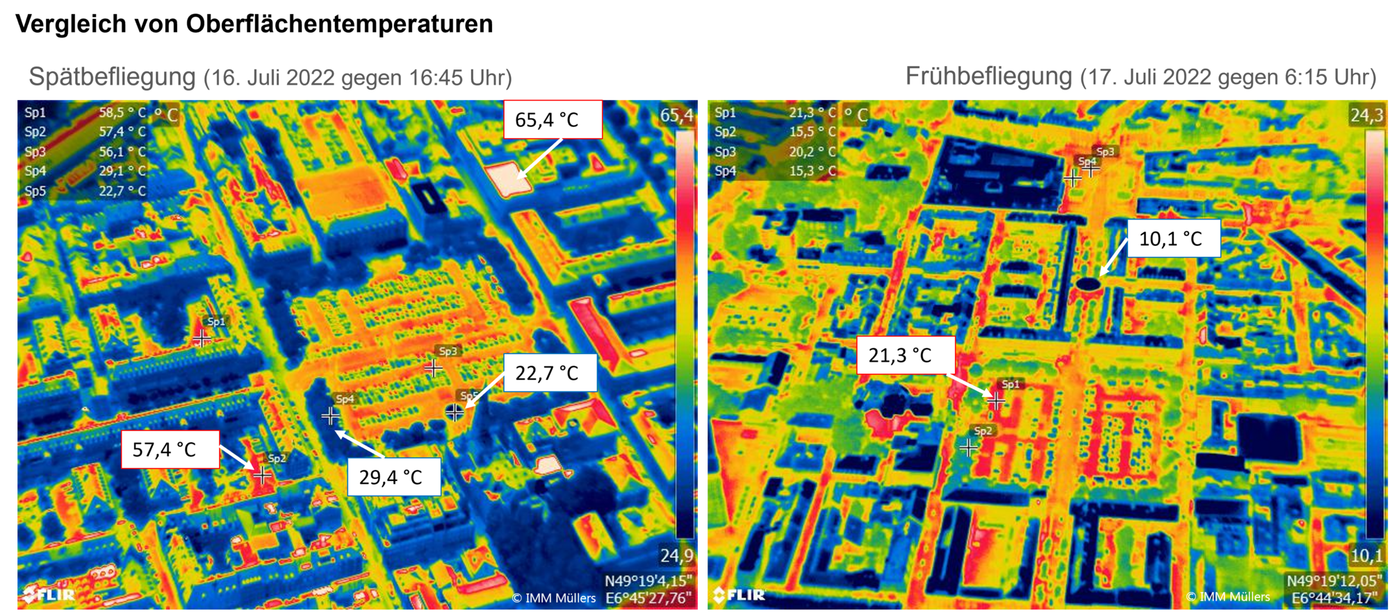 Mittels Bestandsaufnahmen, Begehungen, Befragungen und computergestützter Simulationen werden verschiedene Anpassungsstrategien untersucht: von konventionellen Lösungen wie Klimageräten und Außenjalousien bis hin zu innovativen blau-grünen Maßnahmen wie Dach- und Fassadenbegrünungen. Drohnenbefliegungen zeigen eindrucksvoll das Problem: Im Juli 2022 wurden auf Dachflächen in Saarlouis Oberflächentemperaturen von bis zu 65,4 °C gemessen – solche Extremwerte heizen die darunterliegenden Räume massiv auf.