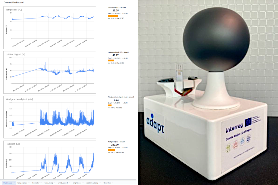 Diese kompakten Messgeräte – etwa so groß wie ein Schuhkarton – erfassen kontinuierlich wichtige Klimadaten: Lufttemperatur, Strahlungstemperatur, Luftfeuchtigkeit, Windgeschwindigkeit und Helligkeit. Die Daten werden über das LoRaWAN-Netzwerk des Landkreises an einen zentralen Server übertragen. Überschreiten die Werte kritische Schwellenwerte, werden automatisch Warnungen generiert – so können Verantwortliche rechtzeitig handeln und Schutzmaßnahmen einleiten.